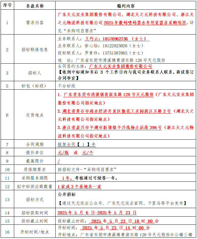 天元股份招标公告|2025年数码喷码墨水年用量需求采购项目