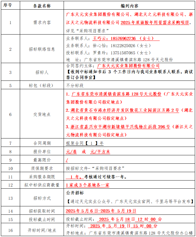 天元股份招标公告|2025年双面胶年用量需求采购项目